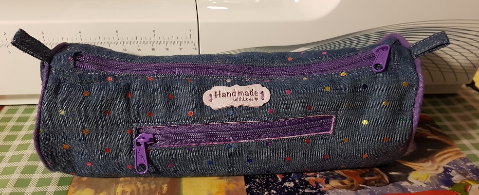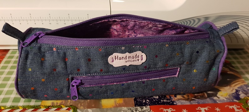 Zusätzlich habe ich ein Außenfach, zum Beispiel für Patronen, Radiergummis oder kleinere Einmerker, aufgenäht. Und da ich in derselben Farbgebung noch Paspelband hatte, wurde dieses auch mit vernäht. Wichtig sind mir auch die beiden kleinen Griffe, die es einfach machen, das Mäppchen schnell zu öffnen oder zu verschließen.