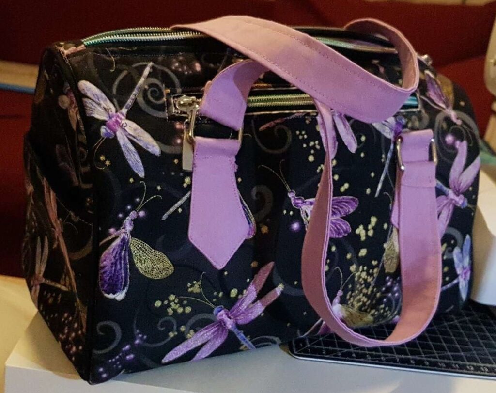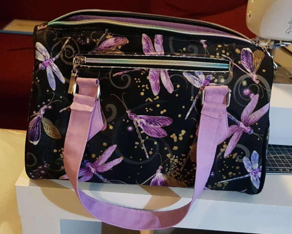 Nachdem meine Handtasche den Geist aufgegeben hat, wollte ich mir selbst eine neue nähen. Dafür habe ich mir diverse Handtaschen angesehen, habe Freunde gefragt, worauf sie Wert legen würden, und mich am Ende doch entschieden, ein paar verschiedene Modelle zu nähen. Hier also Handtasche No2, die mich allein schon mit ihrem tollen Stoffmuster begeistert. Ursprünglich wollte ich ein Tropfenmuster nehmen, habe mich dann aber doch für die Libellen entschieden und bin sehr zufrieden damit.